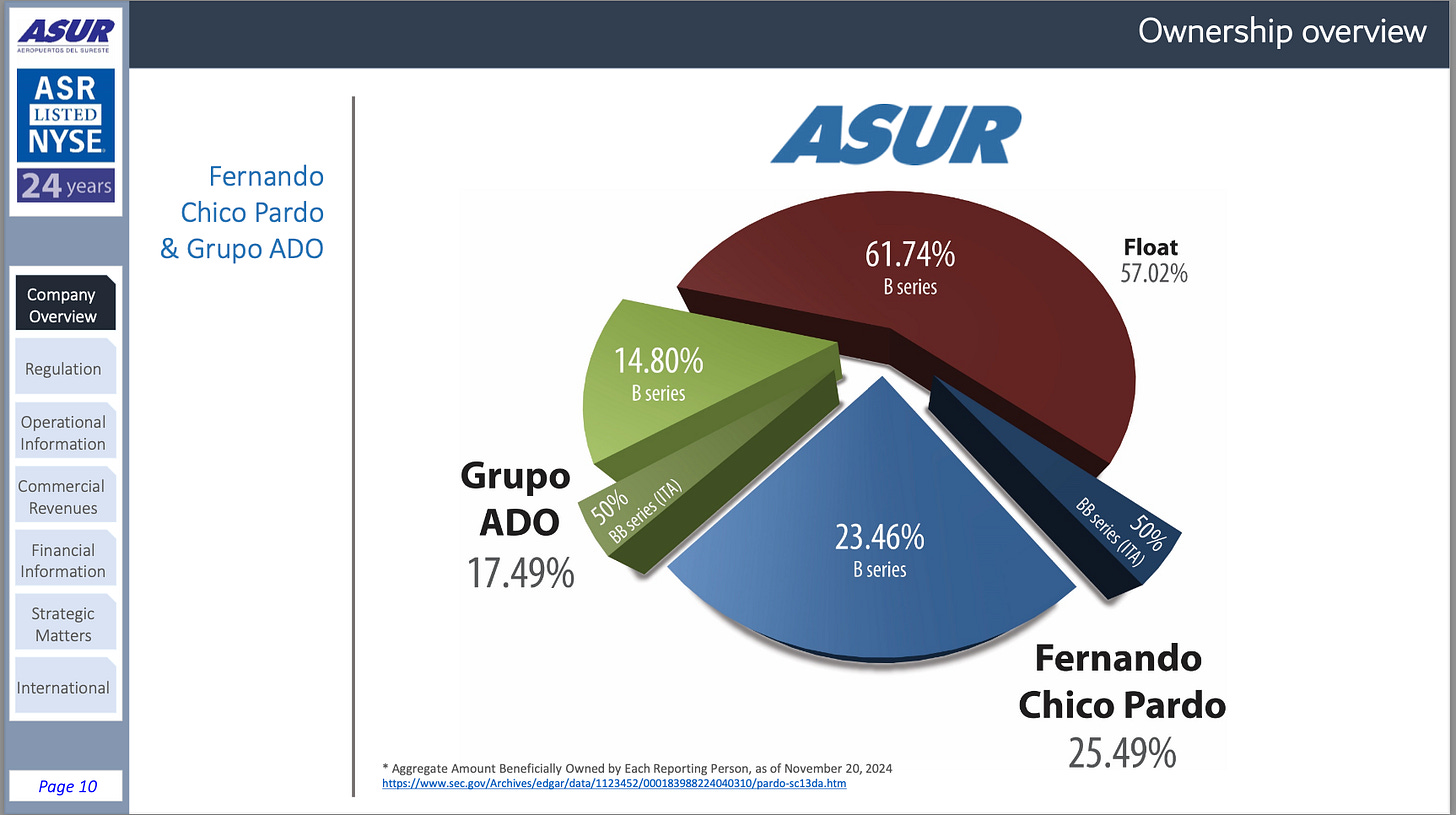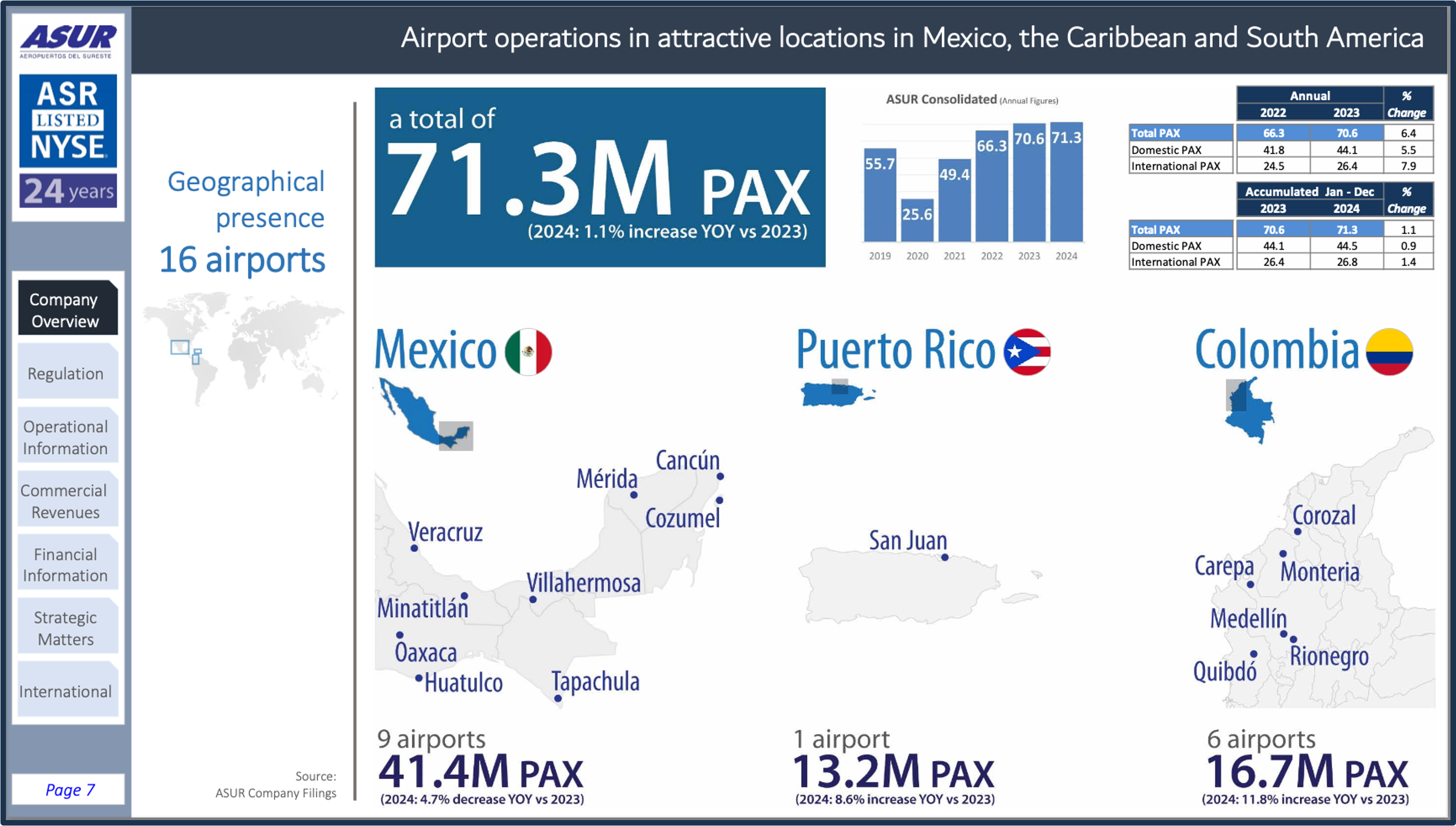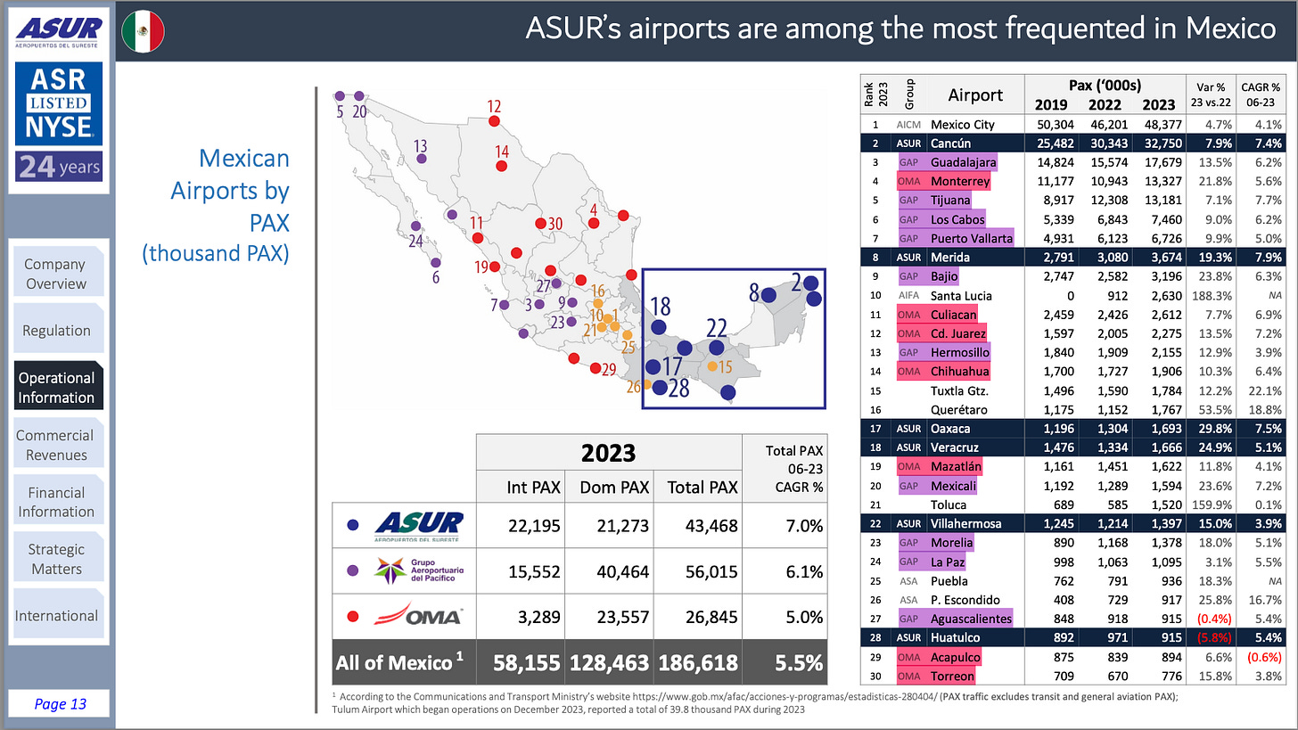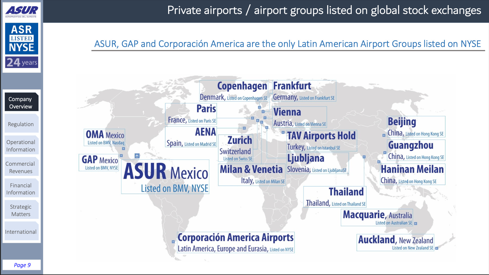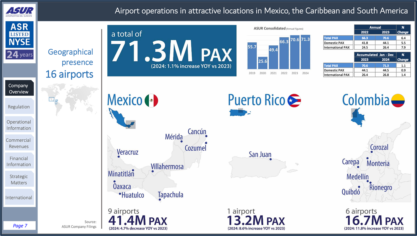 Continuemos desglosando los aeropuertos de ASUR con un total de 16 de los cuales 9 son nacionales y 7 internacionales atendiendo un total de 71 millones de personas anualmente.