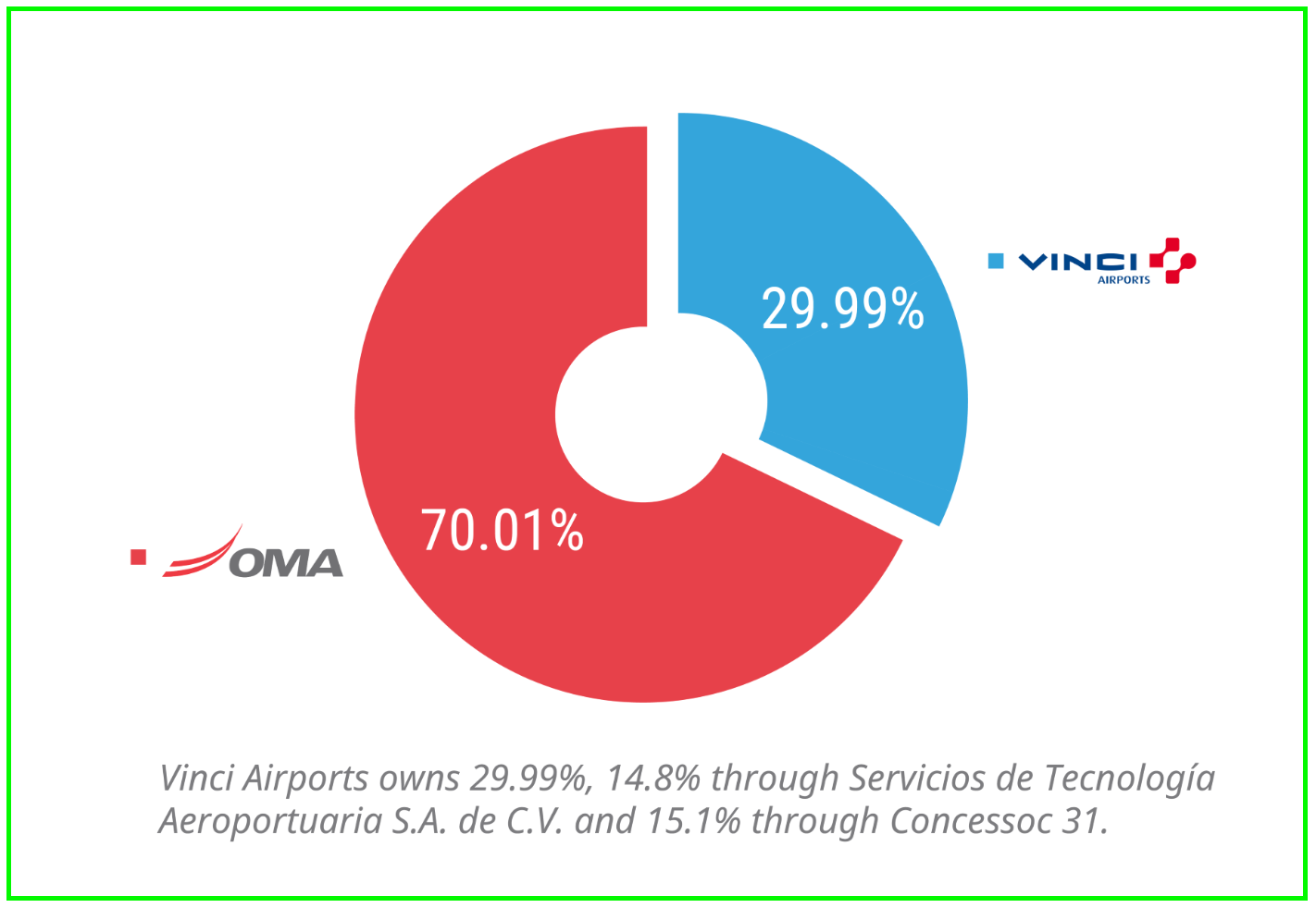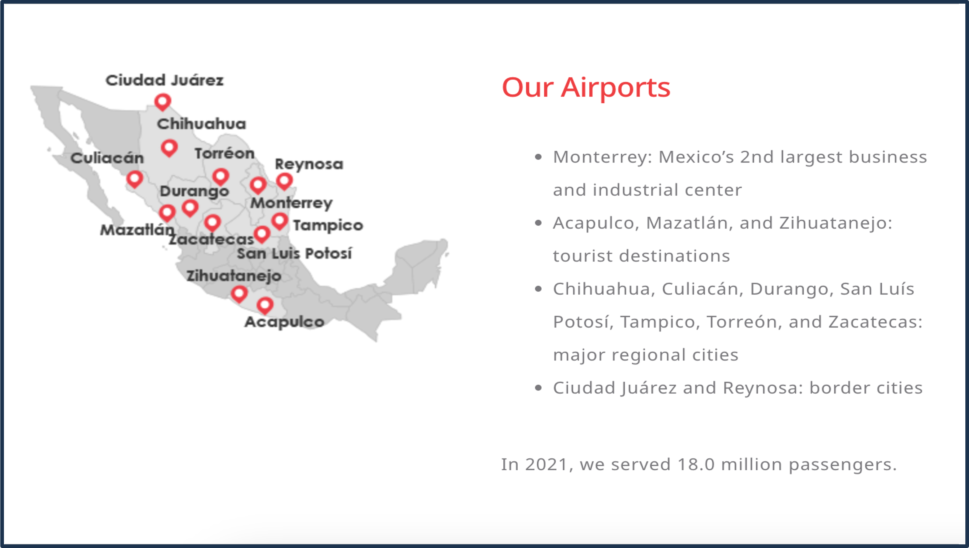 Finalmente tenemos a OMAB con 14 aeropuertos todos ellos 12 son nacionales atendiendo un total de 18 millones de personas anualmente, (numero actualizado a 2021)