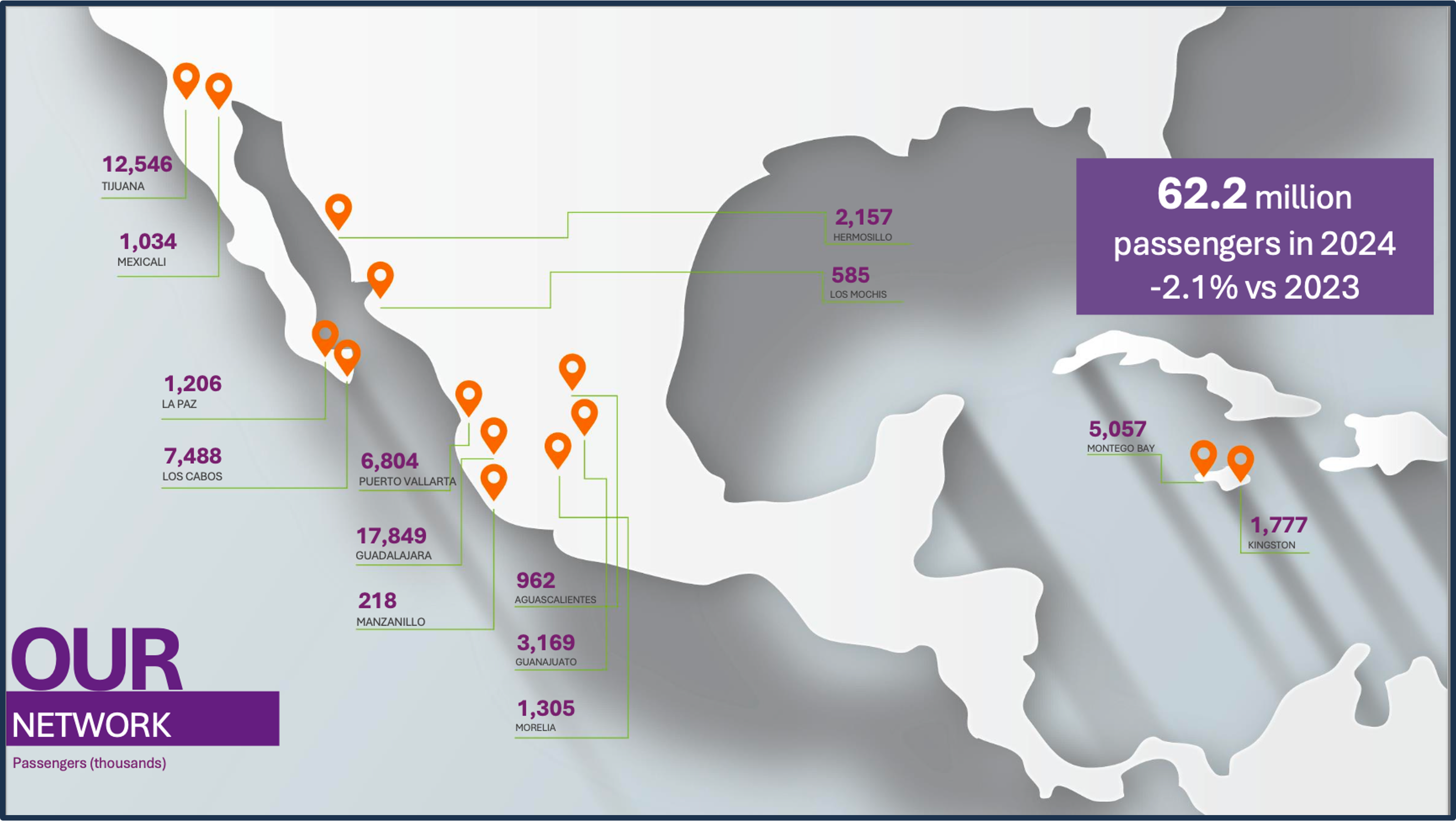 Continuamos con los aeropuertos de GAPB con un total de 14 de los cuales 12 son nacionales y 2 internacionales atendiendo un total de 62 millones de personas anualmente.