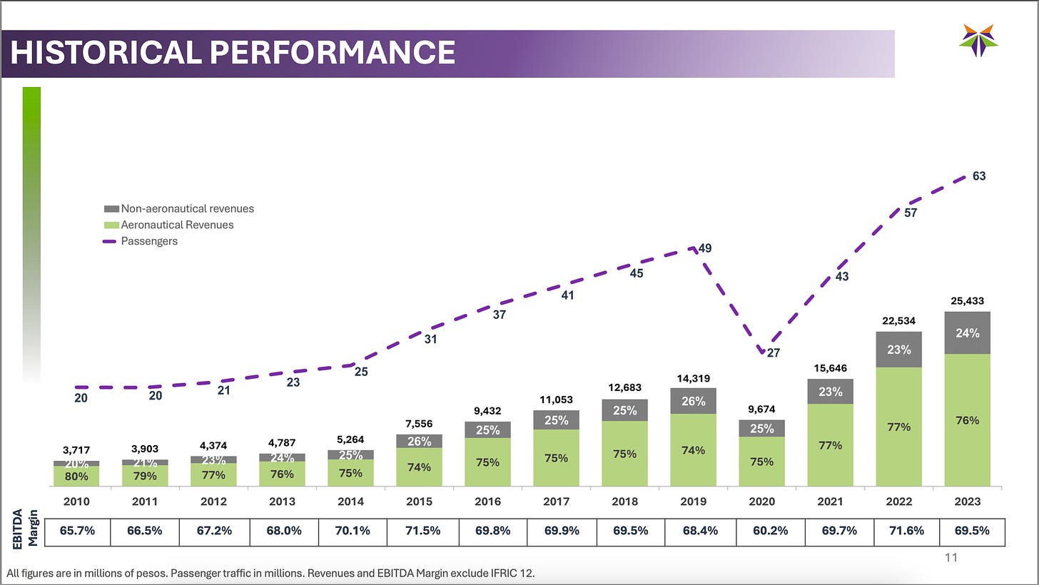 Empecemos por la joya de la corona, el MARGEN EBITDA que de los últimos 10 años ha estado entre el 60 y el 70% para GAPB