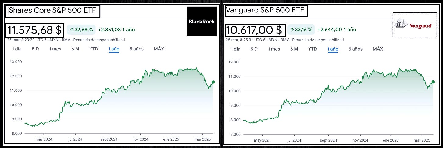 Es una opción popular porque ofrece exposición a una economía diversa y robusta, con empresas que lideran sectores como tecnología, salud y consumo. Sin embargo, para invertir en el S&P 500 desde México, necesitarías comprar una acción del ETF IVV o el VOO que tienen un precio al día de hoy de $11,575 y $10,617 respectivamente por lo que requieres más capital .