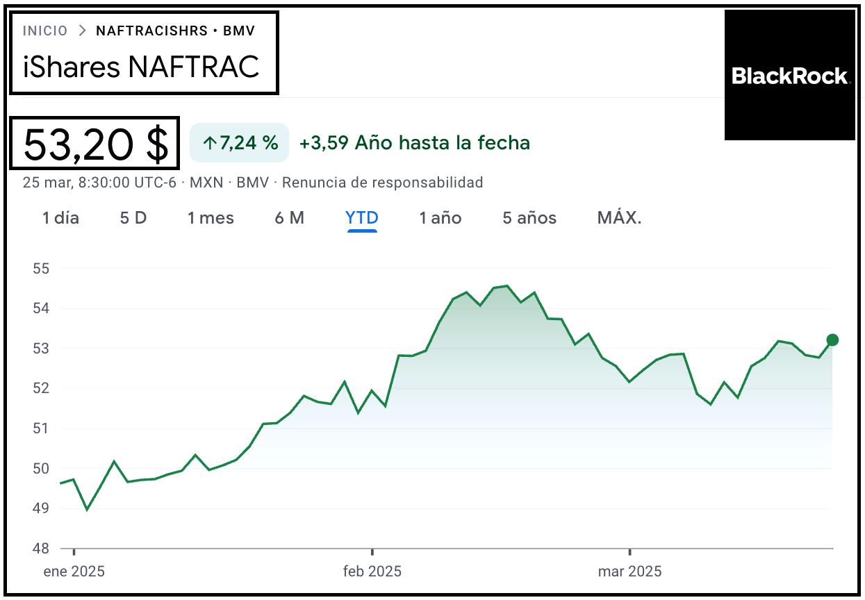 NAFTRAC es un ETF (Exchange Traded Fund) que sigue al Índice de Precios y Cotizaciones (IPC), el principal índice de la Bolsa Mexicana de Valores. El IPC agrupa a las 35 empresas más grandes y líquidas de México, aquellas con mayor valor de mercado y volumen de transacción. Con un precio por acción al día de hoy de $ 53.20 pesos mexicanos.