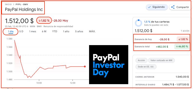 Seguiré revisando a ver si encuentro alguna información igual de relevante, pero por el momento, la acción está teniendo una ligera caída, en linea con la caída general del Nasdaq del 1.36% y PayPal cayendo un 1.82%.
